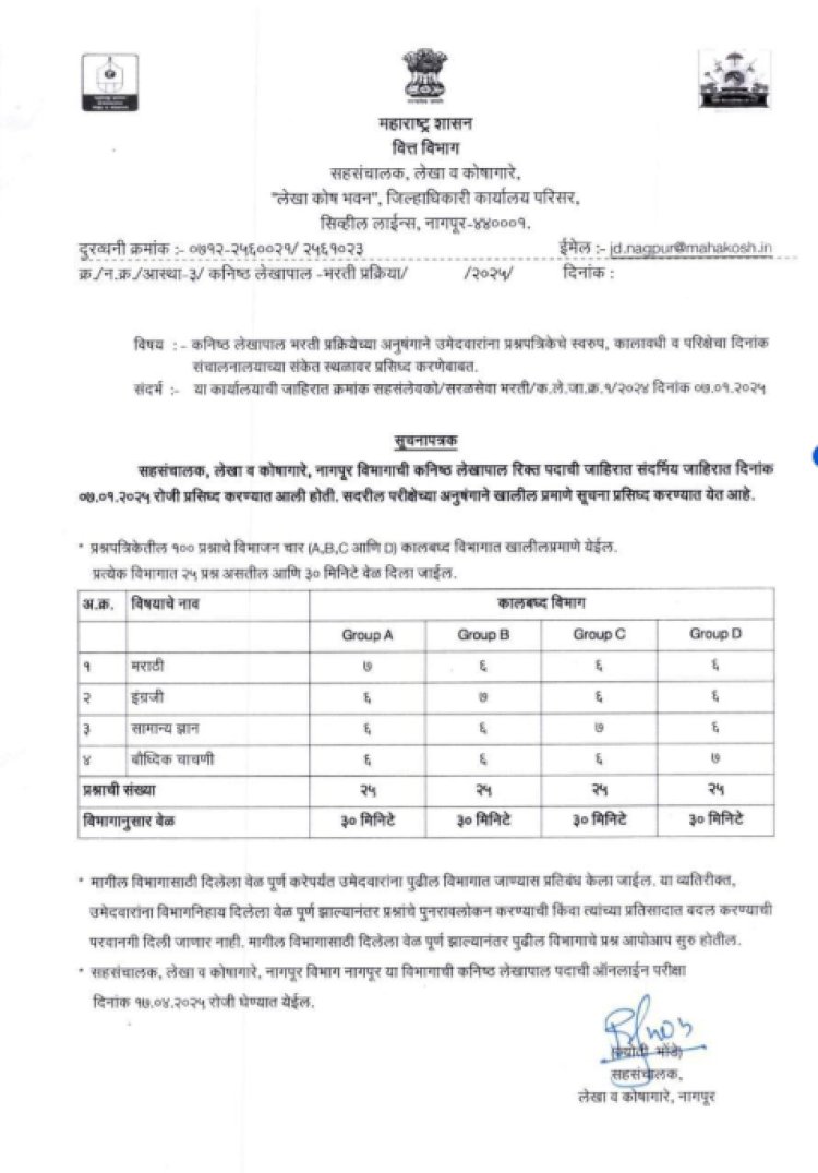 सहसंचालक, लेखा व कोषागारे, नागपूर विभागाची कनिष्ठ लेखापाल रिक्त पदांच्या भरतीसाठी ७ जानेवारी रोजी जाहिरात प्रसिद्ध करण्यात आली होती. सदरील परीक्षेच्या अनुषंगाने सूचना पत्र प्रसिध्द करण्यात येत आहे. त्यामध्ये लेखी परीक्षेचे स्वरूप आणि पॅटर्न कसा असणार याचे स्वरूप देण्यात आले आहे. तसेच या परीक्षेचे प्रवेशपत्र लवकरच उपलब्ध होतील, असे प्रसिद्ध करण्यात आलेल्या सूचना पत्रात म्हटले आहे.