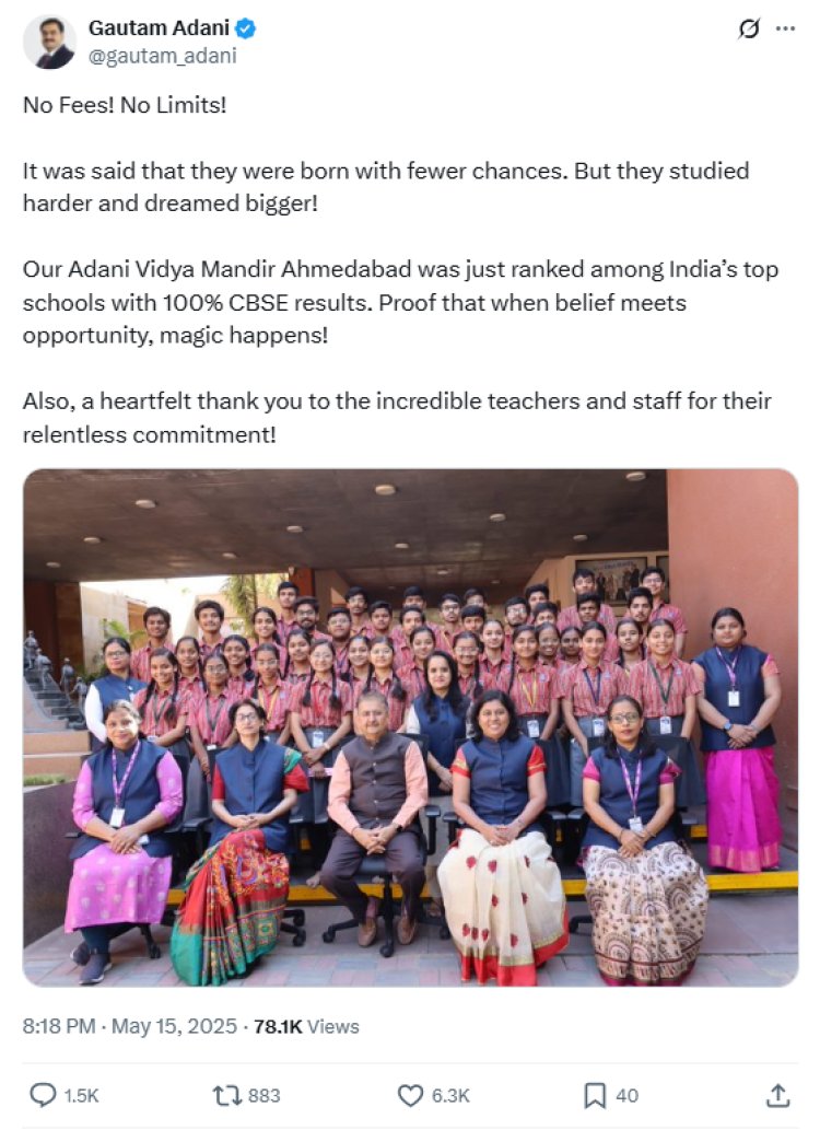 अहमदाबाद येथील अदानी विद्या मंदिर (Adani Vidya Mandir in Ahmedabad) या शाळेने विशेष कामगिरी बजावत राष्ट्रीय स्तरावर मानाचे स्थान पटकावले आहे. नुकत्याच मिळालेल्या National Accreditation Board for Education and Training (NABET) मानांकनात या शाळेने उत्कृष्ट गुण मिळवले आहेत. यासोबतच CBSE बारावी बोर्डाच्या परीक्षेतही शाळेतील सर्व विद्यार्थ्यांनी प्रथम श्रेणीत यश मिळवले आहे. त्यामुळे गौतम अदानी (Gautam adani) यांनी सोशल माध्यमावर एक पोस्ट शेअर करत सर्व विद्यार्थ्यांचे कौतुक केले आहे.