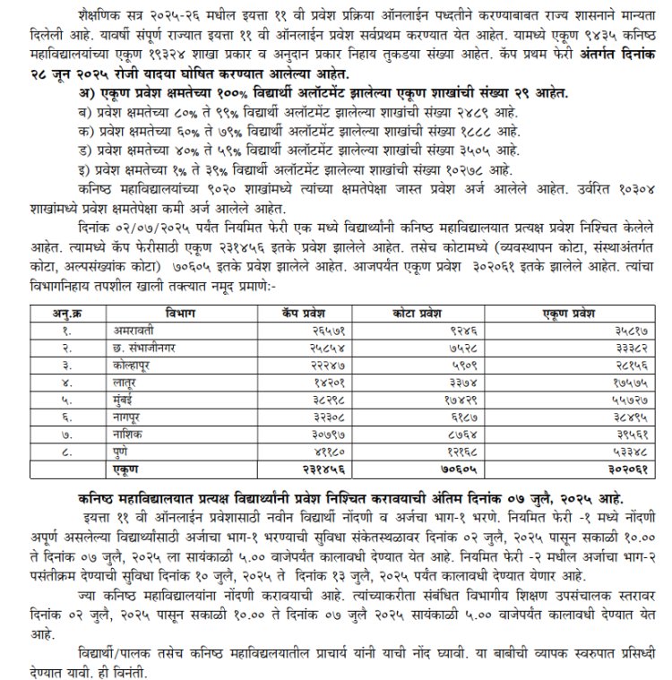 कनिष्ठ महाविद्यालयांच्या ९ हजार २० शाखांमध्ये त्यांच्या क्षमतेपेक्षा जास्त प्रवेश अर्ज आलेले आहेत. उर्वरित १० हजार ३०४ शाखांमध्ये प्रवेश क्षमतेपेक्षा कमी अर्ज आलेले आहेत. २ जुलैपर्यंत नियमित फेरी एक मध्ये विद्यार्थ्यांनी कनिष्ठ महाविद्यालयात प्रत्यक्ष प्रवेश निश्चित केलेले आहेत. त्यामध्ये कॅप फेरीसाठी एकूण २ लाख ३१ हजार ४५६ इतके प्रवेश झालेले आहेत. तसेच कोटामध्ये (व्यवस्थापन कोटा, संस्थाअंतर्गत कोटा, अल्पसंख्यांक कोटा) ७० हजार ६०५ इतके प्रवेश झालेले आहेत. आजपर्यंत एकूण प्रवेश ३ लाख २ हजार ६१ इतके झालेले आहेत.