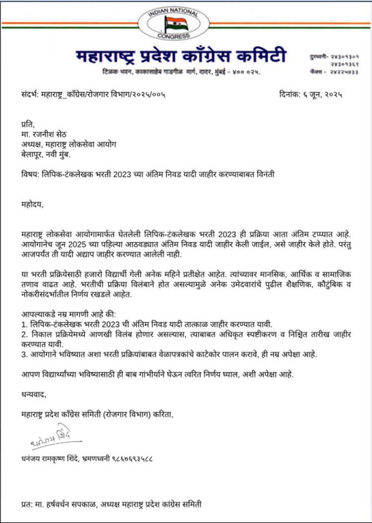 महाराष्ट्र लोकसेवा आयोगामार्फत घेतलेली लिपिक-टंकलेखक भरती 2023 ही प्रक्रिया आता अंतिम टप्प्यात आहे. आयोगानेच जून 2025 च्या पहिल्या आठवड्यात अंतिम निवड यादी जाहीर केली जाईल, असे जाहीर केले होते. परंतु, आजपर्यंत ती यादी अद्याप जाहीर करण्यात आलेली नाही. आपण विद्यार्थ्यांच्या भविष्यासाठी ही बाब गांभीर्याने घेऊन त्वरित निर्णय घ्याल, असे विश्वास या पत्रातून व्यक्त करण्यता आला आहे.