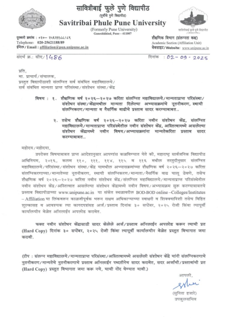 सावित्रीबाई फुले पुणे विद्यापीठाशी (Savitribai Phule Pune University) संलग्नित महाविद्यालये, परिसंस्था, संशोधन संस्थांसाठी शैक्षणिक वर्ष २०२६-२०२७ (Academic year 2026-2027) करिता नवीन संशोधन केंद्र किंवा अस्तित्वात असलेल्या संशोधन केंद्रामध्ये नवीन विषय/अभ्यासक्रम सुरू (New subject/course started) करण्यासाठी नवीन प्रक्रिया सुरू करण्यात आली आहे. त्यासाठी ३० सप्टेंबरपर्यंत विद्यापीठाकडे प्रस्ताव सादर करणे आवश्यक (Proposals must be submitted to the university by September 30th) आहे.