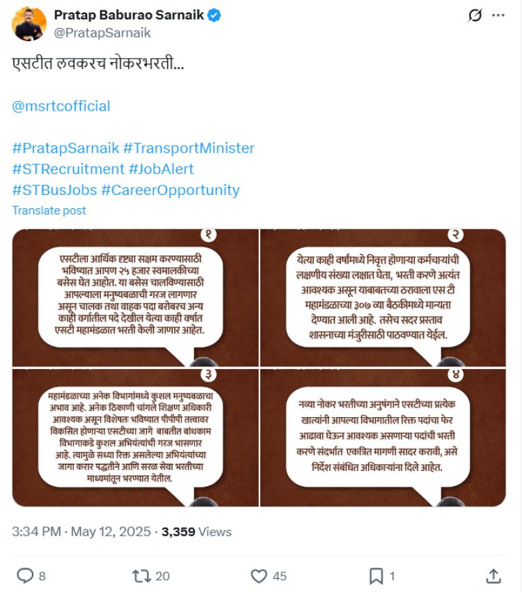 एसटी महामंडळ आर्थिकदृष्ट्या सक्षम करण्यासाठी विविध उपाययोजना राबविल्या जात आहेत. काही दिवसांपूर्वी भविष्यात 25 हजार स्वमालकीच्या बसेस घेतल्या जाणार आहेत. त्यासाठी चालक, वाहकांसह इतर वर्गातील अधिकारी, कर्मचाऱ्यांची गरज भासणार आहे. ही पदे भरण्यासाठी लवकरच भरती प्रकिया सुरु होणार आहे असेही त्यांनी सांगितले आहे.
