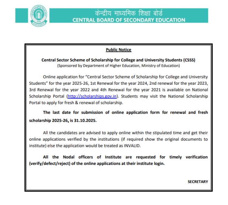 उच्च शिक्षण विभागाच्या योजनेसाठी अर्ज करण्याची शेवटची तारीख ३१ ऑक्टोबर २०२५ आहे. यासाठी राष्ट्रीय शिष्यवृत्ती पोर्टल https://scholarships.gov.in/ ला भेट देऊन या शिष्यवृत्ती योजनेसाठी ऑनलाइन अर्ज करू शकता. सीबीएसईच्या सूचनेनुसार, शिष्यवृत्तीसाठी विद्यार्थ्यांना त्यांच्या महाविद्यालय किंवा विद्यापीठातून त्यांचा अर्ज पडताळून घ्यावा लागणार आहे. विद्यार्थी पडताळणीमध्ये पात्रता निकष पूर्ण करत असेल तर अर्ज करू शकतो. त्यासाठी विद्यार्थ्यांना मूळ कागदपत्रे महाविद्यालय किंवा विद्यापीठाला दाखवावी लागणार आहे. पडताळणी केल्याशिवाय अर्ज करता येणार नाही. महाविद्यालय आणि विद्यापीठातील नोडल अधिकाऱ्यांनी पडताळणीचे काम लवकर पूर्ण करावे, असेही सीबीएसई बोर्डाने म्हटले आहे.