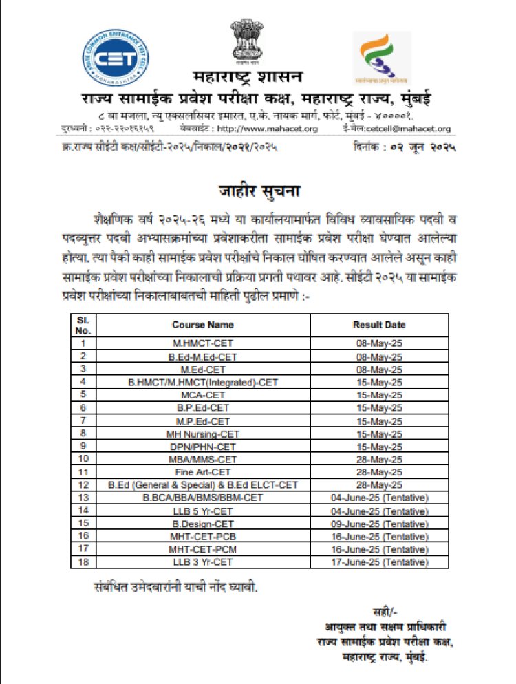 राज्य सामाईक प्रवेश परीक्षा कक्षामार्फत (cet cell) शैक्षणिक वर्ष २०२५-२६ मध्ये विविध व्यावसायिक पदवी व पदव्युत्तर पदवी अभ्यासक्रमांच्या प्रवेशाकरीता सामाईक प्रवेश परीक्षा घेण्यात आलेल्या होत्या. त्यापैकी काही सामाईक प्रवेश परीक्षांचे निकाल (results) घोषित करण्यात आले. मात्र, काही सामाईक प्रवेश परीक्षांच्या निकालाची प्रक्रिया प्रगती पथावर सुरु असल्याचे सीईटी सेलने सांगितले आहे.