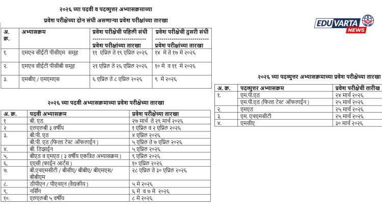 राज्य सामाईक प्रवेश परीक्षा कक्षातर्फे (State Common Entrance Examination Class)२०२६ मध्ये घेतल्या जाणाऱ्या विविध पदवी व पदव्युत्तर अभ्यासक्रमाच्या प्रवेश परीक्षांचे संभाव्य वेळापत्रक (Possible schedule of entrance exams)जाहीर झाले आहे. मागील वर्षी प्रवेश परीक्षेमध्ये १४ लाख विद्यार्थ्यांनी नोंदणी केली होती, यामधील १२ लाख ४६ हजार विद्यार्थ्यांनी प्रवेश परीक्षा दिली होती.सीईटी-सेलने वर्षातून दोन वेळा परीक्षा घेण्याचा निर्णय घेतला आहे.त्यामुळे विद्यार्थ्यांना मोठा दिलासा मिळणार आहे.
