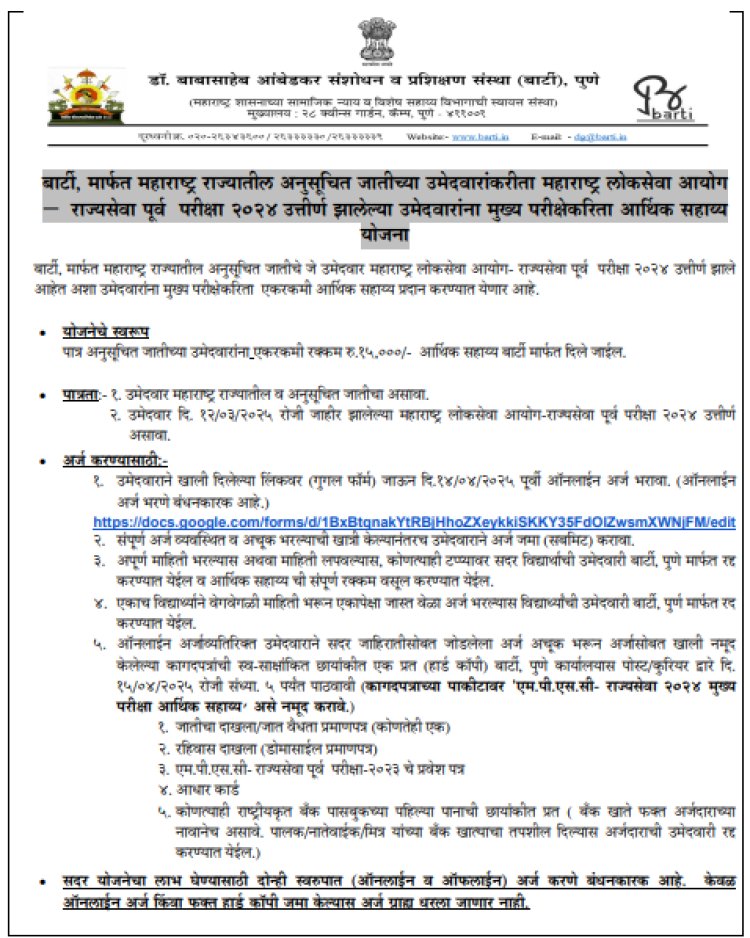 बार्टीमार्फत राज्यसेवा पूर्व परीक्षा २०२४ उतीर्ण उमेदवारांना १५ हजार रुपये