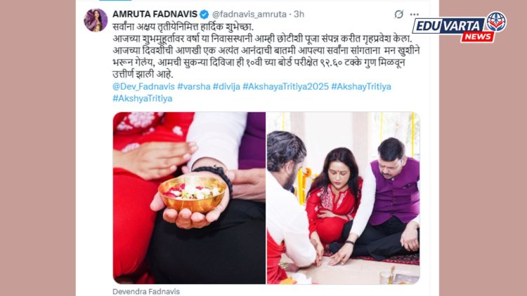 सर्वांना अक्षय तृतीयेनिमित्त हार्दिक शुभेच्छा. आजच्या शुभमुहूर्तावर वर्षा या निवासस्थानी आम्ही छोटीशी पूजा संपन्न करीत गृहप्रवेश केला. आजच्या दिवशीची आणखी एक अत्यंत आनंदाची बातमी आपल्या सर्वांना सांगताना मन खुशीने भरून गेलंय, आमची सुकन्या दिविजा ही १०वी च्या बोर्ड परीक्षेत ९२.६० टक्के गुण मिळवून उत्तीर्ण झाली आहे, अशी पोस्ट करत अमृता फडणवीस यांनी आपल्या लेकीचे कौतूक केल्याचे पाहायला मिळत आहे.