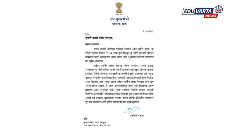 उपमुख्यमंत्री अजित पवार यांनी वैभवी देशमुख हिला पाठविलेल्या अभिनंदनपर पत्रात तूझ्या यशातून राज्यातील इतर विद्यार्थ्यांना लढण्याची, यशस्वी होण्याची प्रेरणा मिळेल, असा विश्वास व्यक्त केला आहे. याबरोबरच तूझ्या यशानं वडील स्वर्गीय संतोष देशमुख यांना खुप आनंद झाला असता, ते आज आपल्यासोबत नसले तरी तितकाच आनंद महाराष्ट्र आज अनुभवत आहे. तुझ्या कष्टांना, जिद्दीला सलाम. यापुढेही शैक्षणिक कारकिर्दीत, जीवनाच्या प्रत्येक टप्प्यावर तूला असंच यश मिळत राहो, आम्ही सर्व कायमच तूझ्यासोबत आहोत,” असा विश्वास देत उपमुख्यमंत्री अजित पवार यांनी तिच्या पुढील वाटचालीस शुभेच्छा दिल्या आहेत.
