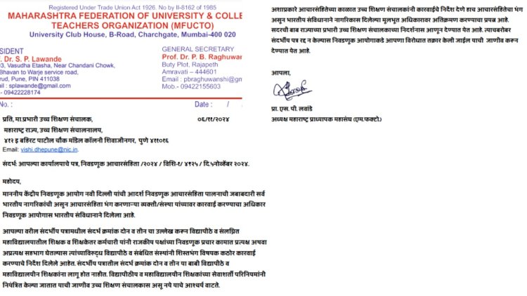 महाराष्ट्र फेडरेशन ऑफ युनिव्हर्सिटी अँड कॉलेज टीचर्स ऑर्गनायझेशन अर्थात 'एमफुक्टो' ने उच्च शिक्षण संचालक डॉ.शैलेंद्र देवळाणकर यांना पत्र पाठवले आहे. या पत्रकानुसार, केंद्रीय निवडणूक आयोगाच्या आदर्श निवडणूक आचारसंहिता पालनाची जबाबदारी सर्व भारतीय नागरिकांची असून आचारसंहिता भंग करणाऱ्या व्यक्ती/संस्था यांच्यावर कारवाई करण्याचा अधिकार निवडणूक आयोगास भारतीय संविधानाने दिलेला आहे.