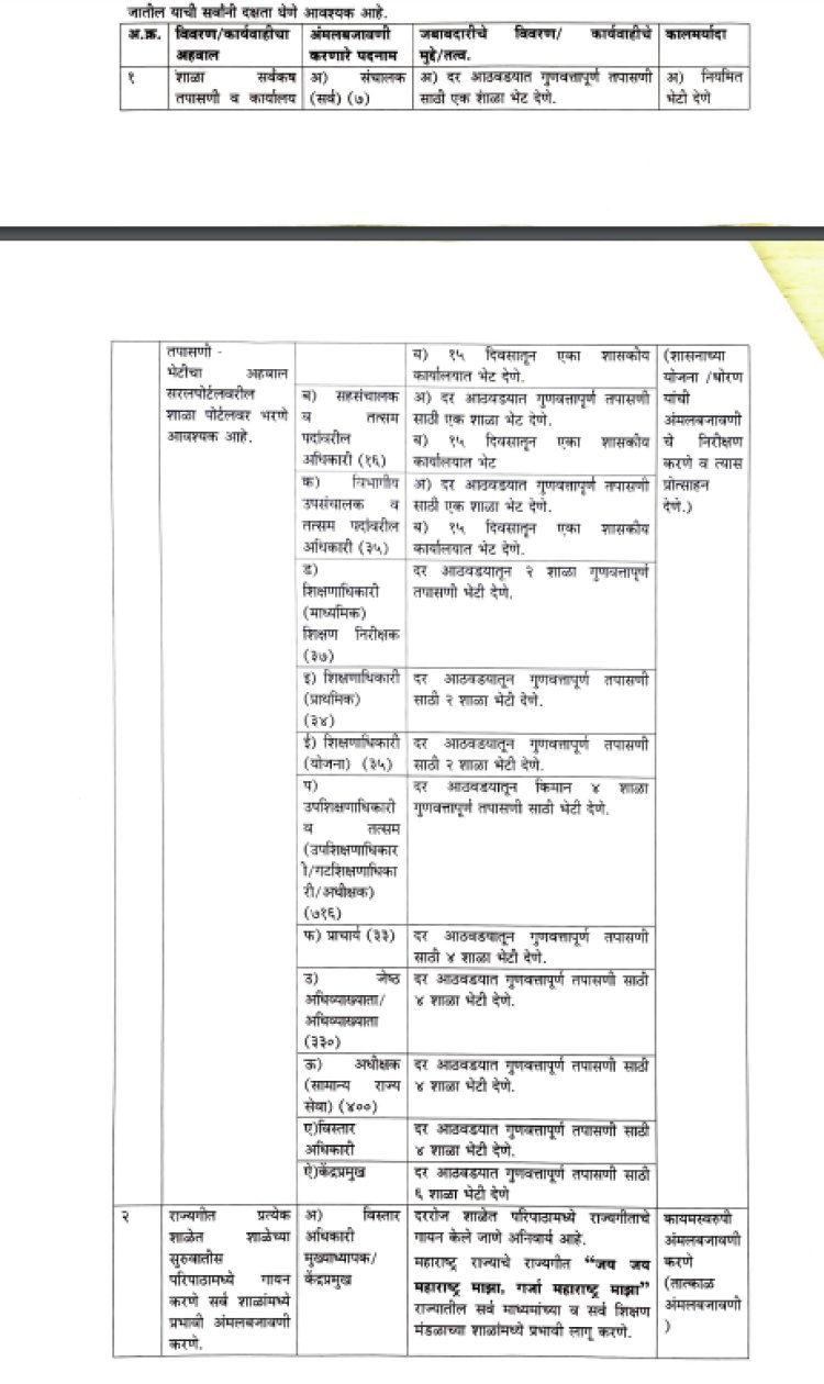राज्यातील प्रत्येक मुलाचे शिक्षण गुणवत्तापूर्ण व आनंददायी पध्दतीने होणे आवश्यक आहे. याकरीता राज्य शासनाच्या धोरणानुसार कृती कार्यक्रमाची जबाबदारी विविध घटकांबर देण्यात येत आहे. या कृती कार्यक्रमाची जबाबदारी वेगवेगळ्या अधिकाऱ्यांवर वेगवेगळ्या पद्धतीने सोपविण्यात आली आहे. या सर्व अधिकार्यांना शिक्षण विभागाने घालून दिलेल्या सूचनांचे पालन योग्य पध्दतीने करावे लागणार आहे. तसेच तात्काळ प्रभावीपणे अंमलबजावणी करणे अनिवार्य आहे.