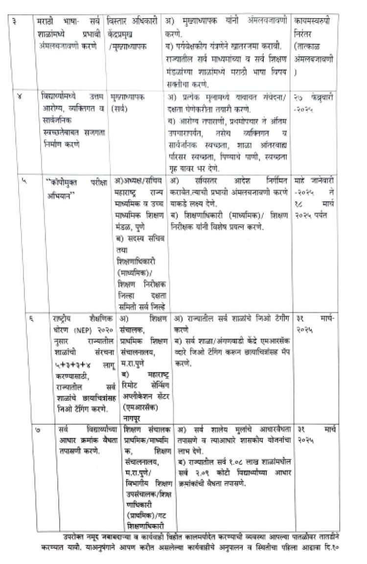 नमूद जबाबदाऱ्या व कार्यवाही विहीत कालमर्यादत करण्याची व्यवस्था आपल्या पातळीवर तातडीने करण्यात यावी. याअनुषंगाने आपण करीत असलेल्या कार्यवाहीचे अनुपालन व स्थितीचा पहिला आढावा १० फेब्रुवारी २०२५ रोजी घेण्यात येणार आहे. त्यानंतर दर १५ दिवसांनी आढावा होईल. त्याचा अंतिम अहवाल प्रत्येक संबंधित अधिकारी यांनी शिक्षण आयुक्त कार्यालयास लिखित स्वरुपात १५ एप्रिल पूर्वी सादर करणे आवश्यक आहे.