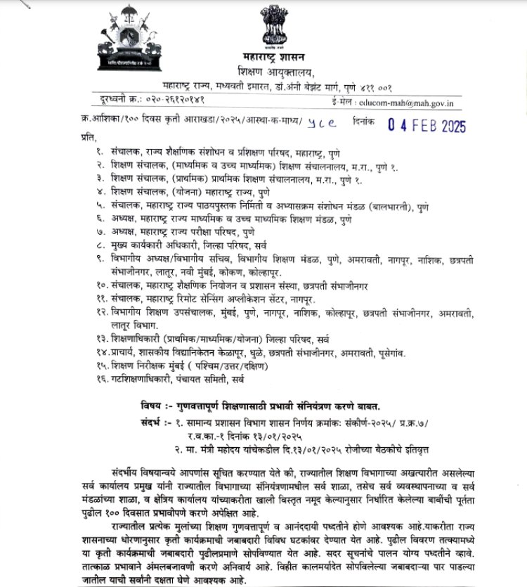 राज्यातील शिक्षण विभागाच्या अखत्यारीत असलेल्या सर्व कार्यालय प्रमुख यांनी विभागाच्या संनियंत्रणामधील सर्व शाळा, तसेच सर्व व्यवस्थापनाच्या व सर्व मंडळांच्या शाळा, व क्षेत्रिय कार्यालय यांच्याकरीता नमूद करण्यात आलेल्या बाबींची पूर्तता पुढील १०० दिवसात प्रभावीपणे करणे अपेक्षित असल्याचे म्हटले आहे.