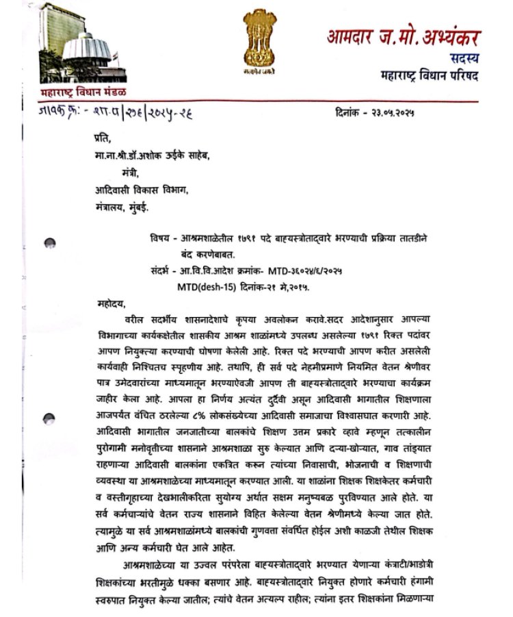 राज्याच्या आदिवासी विकास विभागाने (Department of Tribal Development) नुकताच शासकीय आश्रमशाळांमध्ये (Tribal Ashram School) १ हजार ७९१ शिक्षकांची पदे (1,791 teacher posts) बाह्ययंत्रनेद्वारे कंत्राटी पद्धतीने भरण्याचा निर्णय (Recruitment on a contractual basis) घेतला आहे. मात्र, याला निर्णयाला शिक्षण क्षेत्रातून कडाडून विरोध होत आहे. हा निर्णय तात्काळ रद्द करा अन्यथा तीव्र आंदोलन करण्याचा गर्भित इशारा मुंबई शिक्षक मतदार संघाचे शिवसेना (उद्धव बाळासाहेब ठाकरे) आमदार ज. मो. अभ्यंकार (J. M. Abhyankar) यांनी आदिवासी विभागाचे मंत्री डॉ. अशोक उईके यांना पत्राद्वारे दिला आहे.