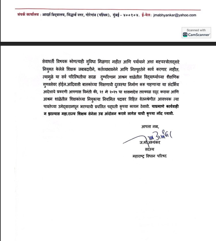 हा निर्णय म्हणजे आदिवासी भागातील शिक्षणापासून वंचित ठरलेल्या ८ टक्के लोकसंख्येचा विश्वासघात करणारा असल्याचे अभ्यंकर यांनी म्हटले आहे. आदिवासी विभागाने राज्यातील शासकीय आश्रमशाळांमध्ये रिक्त जागा भरण्याचा निर्णय घेतला आहे. १ हजार ७९१ रिक्त पदे भरली जाणार आहेत. परंतु, ही पदे नियमित वेतनश्रेणीवर भरली जाणार नसून, कंत्राटी भरली जाणार आहेत. त्यामुळे आदिवासी विद्यार्थ्यांचे नुकसान होणार आहे. कंत्राटी तत्त्वावरील शिक्षक दर्जेदार शिक्षण देऊ शकत नाही. त्यामुळे कंत्राटी पद्धतीने भरती न करता, नियमित शिक्षक भरती करावी, असे अभ्यंकर यांनी पत्रात नमूद केले आहे.