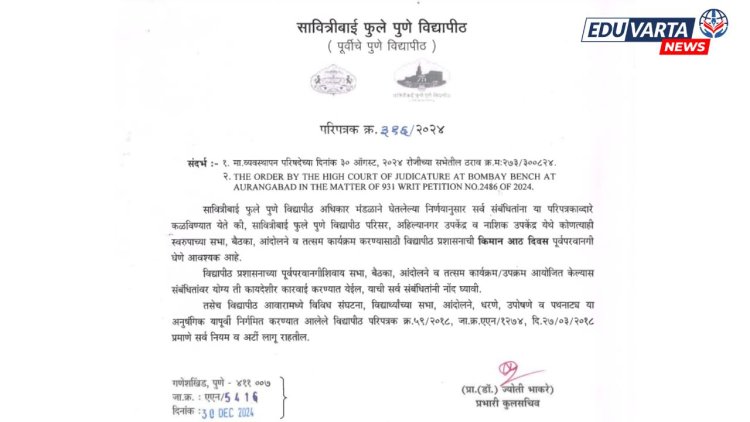 सावित्रीबाई फुले पुणे विद्यापीठाच्या (Savitribai Phule Pune University) परिसरात तसेच विद्यापीठाच्या अहिल्यानगर येथील उपकेंद्रात व नाशिक उपकेंद्रात (Ahilyanagar sub-centre and Nashik sub-centre)कोणत्याही स्वरूपाच्या सभा, बैठका ,आंदोलने (meeting, movement) व तत्सम कार्यक्रम करण्यासाठी विद्यापीठ प्रशासनाची (University Administration)किमान आठ दिवस पूर्वपरवानगी (Eight days prior approval)घ्यावी लागेल, अन्यथा संबंधितांवर कायदेशीर कारवाई केली जाईल, असे परिपत्रक विद्यापीठाच्या प्रभारी कुलसचिव डॉ.ज्योती भाकरे (In-charge Registrar Dr. Jyoti Bhakare)यांनी प्रसिद्ध केले आहे. मात्र, या निर्णयास विद्यार्थी संघटनाकडून विरोध होण्याची शक्यता व्यक्त केली जात आहे.