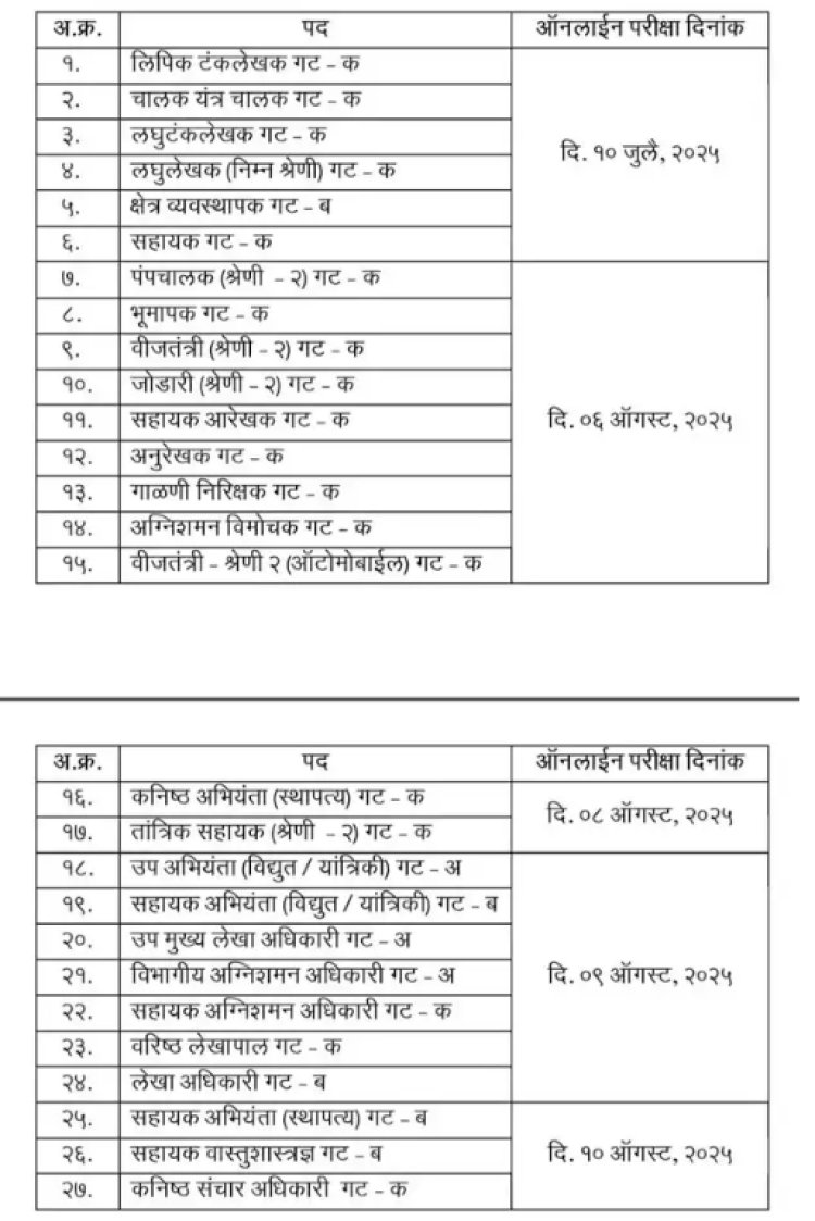 महाराष्ट्र औद्योगिक विकास महामंडळ भरती परीक्षेत (Maharashtra Industrial Development Corporation Recruitment Exam) सहभागी झालेल्या विद्यार्थ्यांसाठी महत्त्वाची बातमी समोर आली आहे. महामंडळाने सरळसेवा भरती २०२३ परीक्षेचे वेळापत्रक जाहीर (Exam schedule announced) केले आहे. जाहीर करण्यात आलेल्या वेळापत्रकानुसार, गट अ, ब आणि क पदांसाठीच्या परीक्षेची माहिती देण्यात आली आहे. सुधारित आरक्षण निकषांमुळे काही परीक्षांचे वेळापत्रक बदलण्यात आले आहे, तर उर्वरित पदांसाठी परीक्षा जुलै आणि ऑगस्ट २०२५ मध्ये होणार आहेत. या सर्व परीक्षा १० जुलै ते १० ऑगस्ट या कालावधीत (Exams from July 10 to August 10) पार पडणार आहेत.