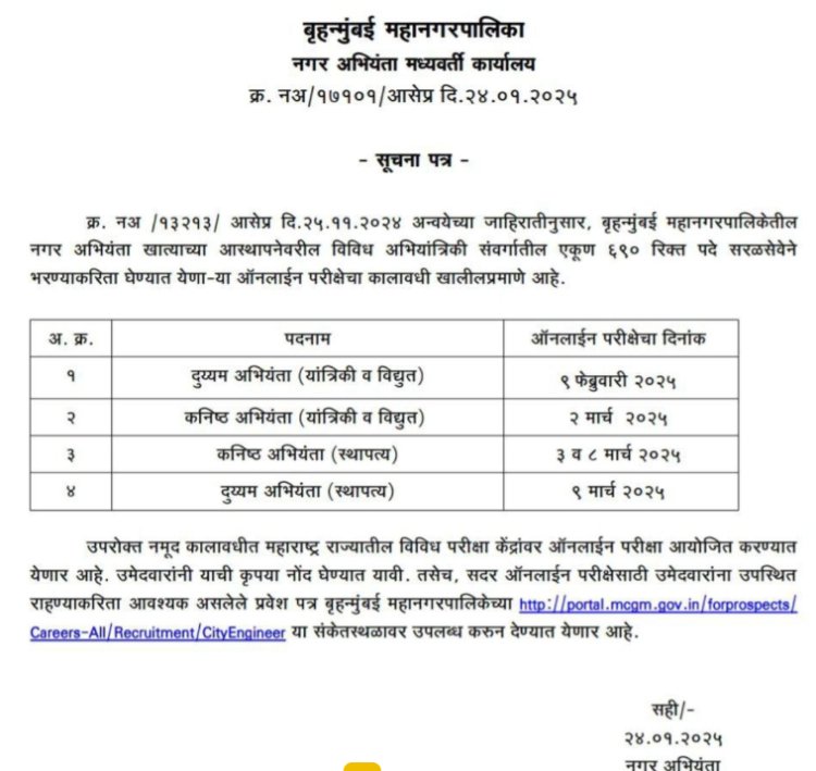 मुंबई महापालिकेद्वारे ६९० पदांसाठी राबवलेल्या भरती परीक्षांच्या तारखा जाहीर