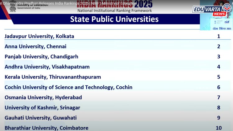केंद्रीय शिक्षण विभागाच्या वतीने NIRF रँकिंग 2025 गुरूवारी जाहीर झाले आहे.केंद्रीय शिक्षण मंत्री धर्मेंद्र प्रधान, केंद्रीय राज्य शिक्षण मंत्री सुकांता मुजुमदार, उच्च शिक्षण विभागाचे प्रधान सचिव विनीत जोशी , एआयसीटीचे अध्यक्ष टी.जी. सिताराम, एनबीए अध्यक्ष अनिल सहस्रबुद्धे, अनिल नासा यांच्या उपस्थितीत स्टेट यूनिवर्सिटी रँकिंगची घोषणा करण्यात आली.
