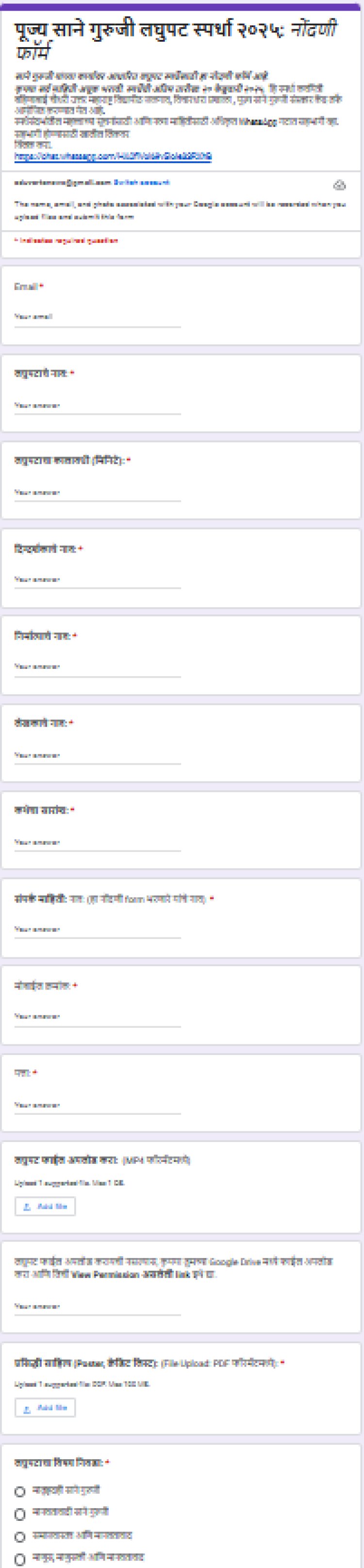 या 'लघुपटासाठी मातृहृदयी साने गुरुजी', 'समाजवास्तव आणि मानवतावाद','साने गुरुजींच्या साहित्यातील करुणाभाव', 'साने गुरुजींच्या कथा'; 'आजच्या काळातील प्रासंगिकता', 'मानवतावादी साने गुरुजी', 'माणूस माणुसकी आणि मानवतावाद', 'साने गुरुजींचे जीवन व कार्य' हे विषय (Topic for competition) ठेवण्यात आले आहे.