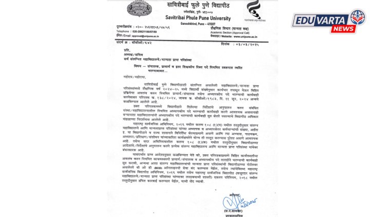 पुणे विद्यापीठाशी संलग्न अहिल्यानगर, नाशिक व पुणे जिल्ह्यातील संलग्न महाविद्यालयांनी नियमित प्राचार्य, संचालक तसेच प्राध्यापकांची पदे भरण्याची कार्यवाही करावी. याबाबतचे पत्रक 11 जून 2024 रोजी प्रसिद्ध करण्यात आले होते. मात्र, या पत्रकाचे पालन अनेक महाविद्यालयांनी केले नसल्याचे आढळून आले आहे. बऱ्याच महाविद्यालयांनी प्राध्यापकांची पदे भरण्याची कार्यवाही सुरू केली नसल्याचे विद्यापीठ अधिकार मंडळाच्या निदर्शनास आले आहे.
