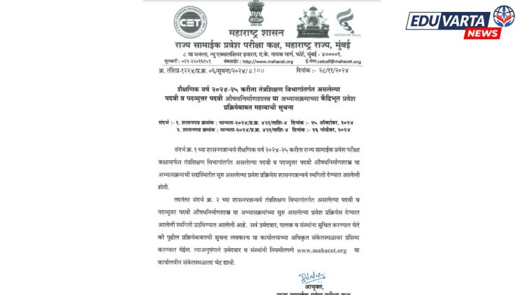 राज्यात १५ ऑक्टोबरपासून विधानसभा निवडणुकीची आचारसंहिता (Assembly Election Code of Conduct) लागू झाल्याने फार्मसी अभ्यासक्रमाची प्रवेश प्रक्रिया (Pharmacy course admission process) रखडली होती. मात्र, आता निवडणुका पार पडल्याने ही प्रवेश प्रक्रिया येत्या १ डिसेंबरनंतर कधीही सुरू होऊ शकते. त्यामुळे फार्मसी प्रवेशांच्या प्रतीक्षेत असलेल्या विद्यार्थ्यांना दिलासा मिळाला आहे. तसेच फार्मसी महाविद्यालय डिसेंबरच्या मध्यापासून म्हणजे १५ डिसेंबरनंतर कधीही सुरू होण्याची शक्यता वर्तवण्यात येत आहे.