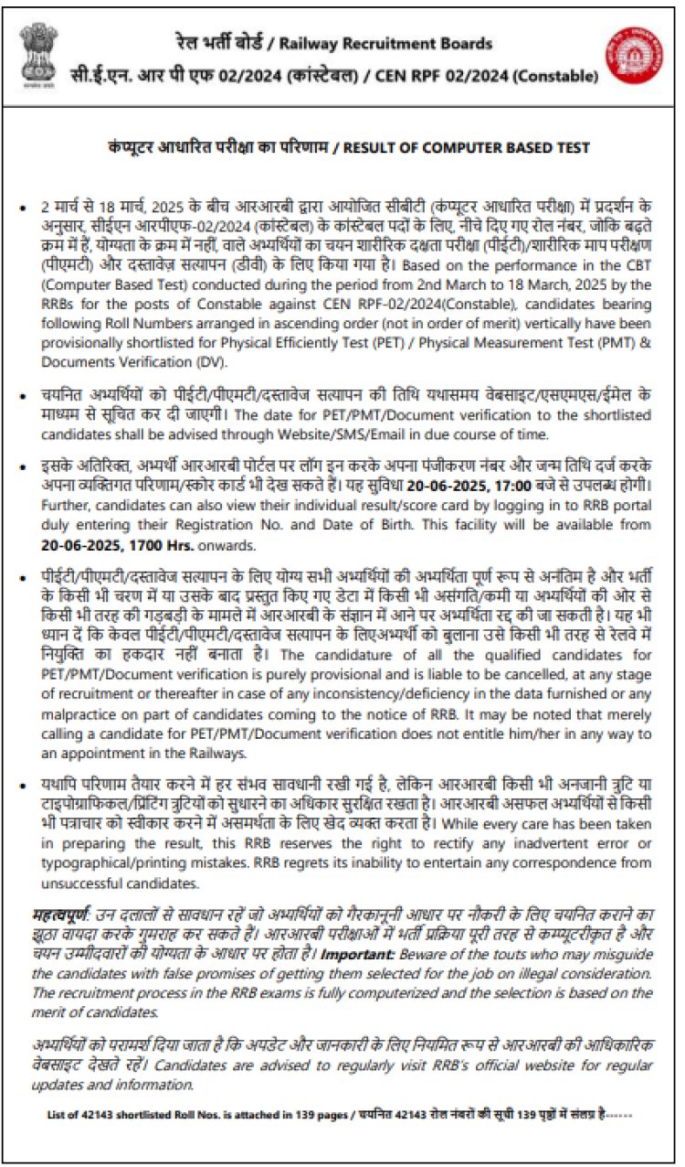 निकाल लागल्यानंतर, ज्या उमेदवारांचा रोल नंबर निकाल यादीत आहे त्यांना शारीरिक कार्यक्षमता चाचणी (PET)/ शारीरिक मापन चाचणी (PMT) आणि कागदपत्र पडताळणी (DV) उत्तीर्ण व्हावे लागेल. सर्व परीक्षा उत्तीर्ण झालेले उमेदवार RPF कॉन्स्टेबल पदासाठी पात्र ठरतील. RRB मार्फत उमेदवारांना SMS/वेबसाइट/ईमेलद्वारे DV/PET/PMT ची तारीख सांगण्यात येईल.