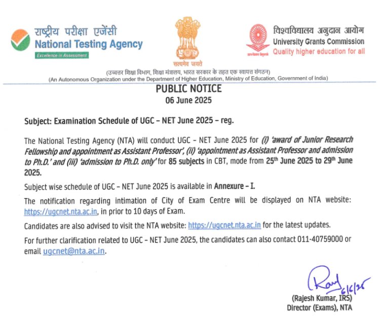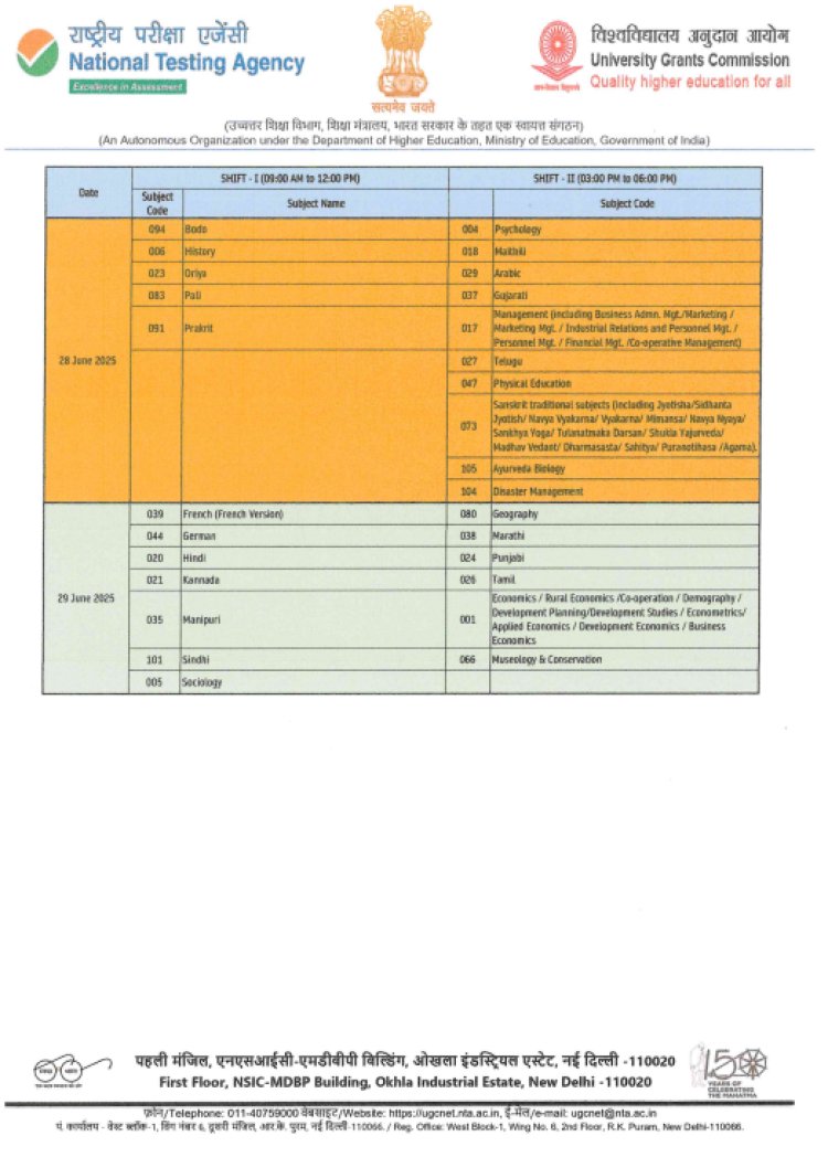 नॅशनल टेस्टिंग एजन्सीने (NTA) जून २०२५ च्या UGC NET सत्राच्या परीक्षेच्या तारखांमध्ये (exam timetable) सुधारणा केली आहे. अधिसूचनेनुसार, ही परीक्षा आता २५ जून ते २९ जून २०२५ या कालावधीत घेतली जाईल. उमेदवारांना विषयवार वेळापत्रक https://ugcnet.nta.ac.in/ या अधिकृत पोर्टलवर पाहता येणार आहे.