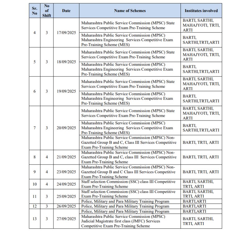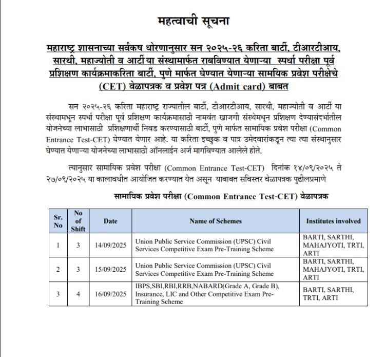 डॉ. बाबासाहेब आंबेडकर संशोधन व प्रशिक्षण संस्थेने एक नोटीस प्रसिद्ध केली आहे. या नोटीसमध्ये सामायिक प्रवेश परीक्षा 2025-26 च्या वेळापत्रकाची माहिती देण्यात आली आहे. परीक्षेच्या तीन दिवस अगोदर परीक्षेचे वेळापत्रक जाहीर केल्यामुळे विद्यार्थ्यांमध्ये गोंधळ उडाला आहे. ही परीक्षा बार्टी (BARTI), टीआरटीआय (TRTI), सारथी (SARTHI), महाज्योती (Mahajyyoti), आणि एआरटीआय (ARTI) द्वारे आयोजित विविध स्पर्धा परीक्षांच्या पूर्व-प्रशिक्षण कार्यक्रमांसाठी उमेदवारांची निवड करण्यासाठी घेतली जाणार आहे.