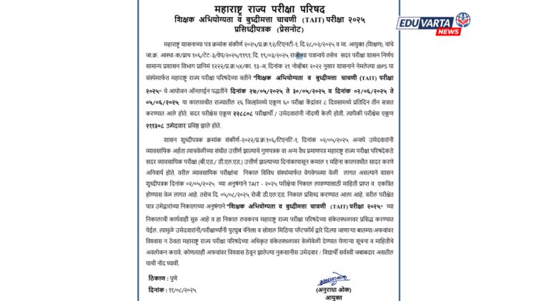 शिक्षक अभियोग्यता व बुद्धिमत्ता चाचणी परीक्षेचा निकाल (TAIT results) केव्हा जाहीर होणार याबाबत परीक्षार्थीमध्ये उत्सुकतेचे वातावरण आहे. मात्र,गेल्या काही दिवसांपासून समाज माध्यमांवर या संदर्भातील उलट सुलट अफवा पसरवल्या जात आहेत. राज्य परीक्षा परिषदेने (State Examination Council ) टीएआयटी (TAIT)परीक्षेच्या निकालाची तयारी पूर्ण केली असून 15 ऑगस्ट पूर्वी अंतिम निकाल जाहीर केला जाणार असल्याचे परीक्षा परिषदेतील वरिष्ठ अधिकाऱ्यांनी सांगितले. दरम्यान 11 ऑगस्ट रोजी परीक्षा परिषदेने निकालासंदर्भातील एक प्रसिद्धीपत्रक काढले आहे.