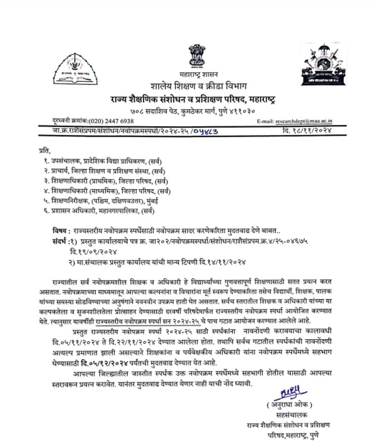 याआधी राज्यस्तरीय नवोपक्रम स्पर्धा २०२४-२५ साठी स्पर्धकांना नाव नोंदणीसाठी दि. ५ नोव्हेंबर २०२४ ते २२ नोव्हेंबर २०२४ पर्यंतचा कालावधी देण्यात आला होता. तथापि, सर्वच गटातील स्पर्धकांची नाव नोंदणी अल्प प्रमाणात झाली असल्याने शिक्षकांना व पर्यवेक्षकीय अधिकारी यांना या स्पर्धेमध्ये सहभाग घेण्यासाठी ५ डिसेंबर पर्यंत मुदतवाढ देण्यात आली आहे.