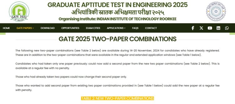 इंडियन इन्स्टिट्यूट ऑफ टेक्नॉलॉजी (IIT) रुरकीने अभियांत्रिकी (GATE 2025) मधील ग्रॅज्युएट ॲप्टिट्यूड टेस्टसाठी (Graduate Aptitude Test In Engineering) नवीन दोन-पेपर जोडण्याची घोषणा केली आहे. ज्या उमेदवारांनी यापूर्वी फक्त एक पेपर घेतला होता, ते आता नवीन दोन पेपर कॉम्बिनेशनमधून दुसरा पेपर जोडू शकतात. (two paper combinations) GATE 2025 परीक्षेसाठी नोंदणी केलेले अर्जदार नवीन दोन-पेपर कॉम्बिनेशनचे तपशील तपासण्यासाठी IIT रुरकीच्या https://gate2025.iitr.ac.in/two-paper-combinations.html या अधिकृत वेबसाइटला भेट देऊ शकतात.