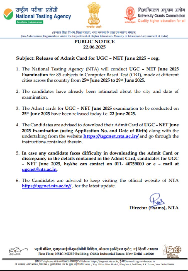 यापूर्वी, एजन्सीने २५ जूनच्या परीक्षांसाठी UGC NET प्रवेशपत्र प्रसिद्ध केले होते. प्रवेश परीक्षा २५ ते २९ जून दरम्यान होणार आहे. उर्वरित परीक्षा दिवसांसाठी हॉलतिकीट नंतर प्रसिद्ध केली जाणार आहेत. एजन्सीने २५ ते २८ जूनच्या परीक्षांसाठी परीक्षा शहर सूचना स्लिप देखील प्रसिद्ध केल्या आहेत.