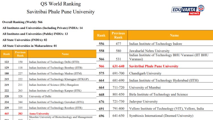 जगभरातील शैक्षणिक संस्थांचे क्यूएस वल्ड रँकिंग जाहीर झाले असून त्यात दिल्ली विद्यापीठ 328 व्या क्रमांकावर, अण्णा विद्यापीठ 456 व्या क्रमांकावर आहे. सावित्रीबाई फुले पुणे विद्यापीठ मागील वर्षी 631 ते 640 च्या दरम्यान होते.परंतु, यंदा विद्यापीठाच्या रँकिंगमध्ये 566 पर्यंत वाढ झाली आहे. क्यूएस वर्ल्ड रँकिंग मध्ये मुंबई विद्यापीठ 664 व्या क्रमांकावर आहे तर सिम्बॉयसिस इंटरनॅशनल युनिव्हर्सिटी 696 व्या क्रमांकावर आहे.