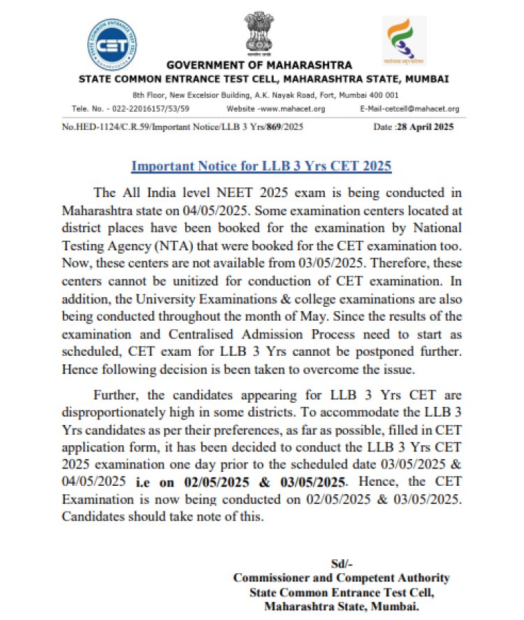 सीईटी सेलने दिलेल्या अधिकृत माहितीनुसार, एलएलबी ३ वर्षे परीक्षेसाठी महाराष्ट्रासह इतर राज्यांमधील विविध परीक्षा केंद्र निश्चित करण्यात आली आहे. ही परीक्षा २ मे आणि ३ मे रोजी घेण्यात येणार आहे. यापूर्वी ही परीक्षा ३ मे आणि ४ मे रोजी पार पडणार होती मात्र, ४ मे रोजी नीट परीक्षा असल्याने काही परीक्षा केंद्र उपलब्ध नाहीत त्यामुळे एकदिवस आधी या परीक्षा होत आहेत. एमएएच एलएलबी ३ वर्षांच्या सीईटी २०२५ परीक्षा अनेक सत्रांमध्ये ऑनलाइन पद्धतीने घेतली जाणार असून उमेदवारांनी आवश्यक कागदपत्रांसह आपल्याला देण्यात आलेल्या परीक्षा केंद्रावर वेळेवर उपस्थित राहण्याचे आवाहन सीईची सेलकडून करण्यात आले आहे.