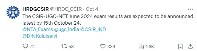 नॅशनल टेस्टिंग एजन्सीतर्फे (NTA) CSIR UGC NET 2024 चा निकाल (Result) 15 ऑक्टोबरपर्यंत जाहीर होण्याची शक्यता आहे. 'एक्स'वर पोस्ट करत CSIR कडून ही तात्पुरती तारीख जाहीर करण्यात आली आहे. ज्या उमेदवारांनी (candidates) 25, 26 आणि 27 जुलै रोजी CSIR UGC NET परीक्षा (Exams) दिली होती. उमेदवार निकाल जाहीर झाल्यानंतर https://csirnet.nta.ac.in/ या अधिकृत वेबसाईटवर पाहू शकतात.