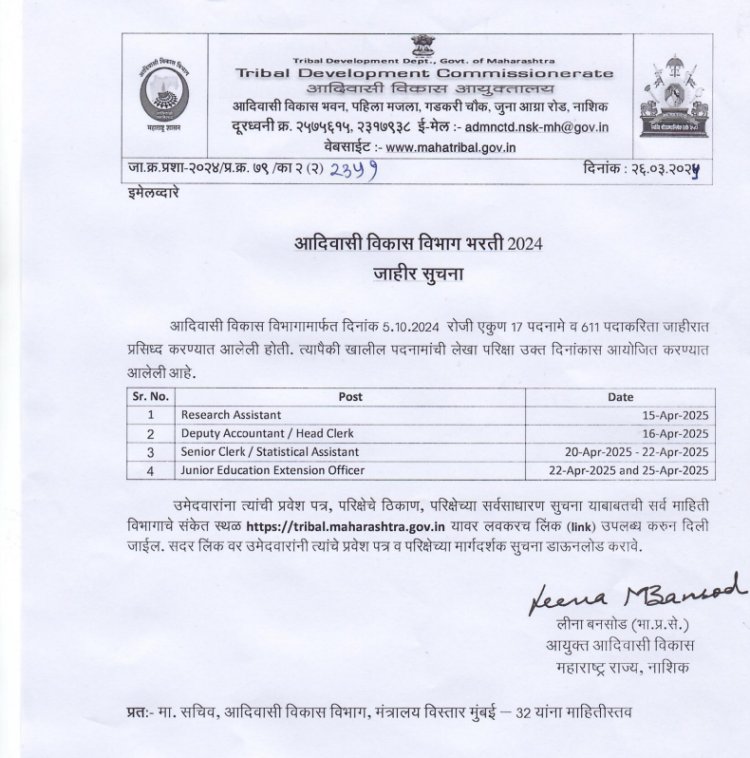 महाराष्ट्र राज्य आदिवासी विकास विभागामार्फत विविध पदांसाठी घेतल्या जाणाऱ्या भरती परीक्षेच्या तारखा जाहीर करण्यात आल्या आहेत. वेळापत्रकानुसार ९ एप्रिल ते २५ एप्रिल दरम्यान वेगवेगळ्या तारखेला वेगवेगळ्या पदांसाठी परीक्षा घेतली जाणार आहेत.