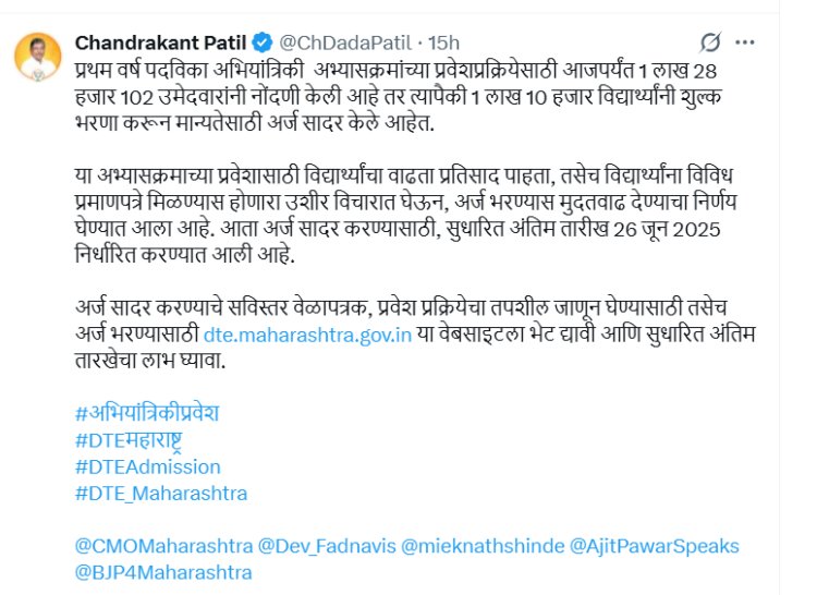 उच्च व तंत्र शिक्षणमंत्री चंद्रकांत पाटील म्हणाले, "विद्यार्थ्यांना प्रवेश प्रक्रियेतून वंचित ठेवू नये म्हणून अर्ज सादर करण्यास मुदतवाढ देण्यात यावी, असे निर्देश देण्यात आले आहेत." अर्ज करण्याची अंतिम मुदत २६ जून २०२५ पर्यंत वाढवण्यात आली आहे. प्रवेश प्रक्रियेचे वेळापत्रक आणि इतर माहिती संकेतस्थळावर उपलब्ध आहे, असेही त्यांनी सांगितले. यासंदर्भातील सविस्तर वेळापत्रक, प्रवेश प्रक्रियेचा तपशील आणि अर्ज सादरीकरणासाठी आवश्यक माहिती https://dte.maharashtra.gov.in या संकेतस्थळावर उपलब्ध असल्याचेही मंत्री पाटील यांनी स्पष्ट केले आहे.