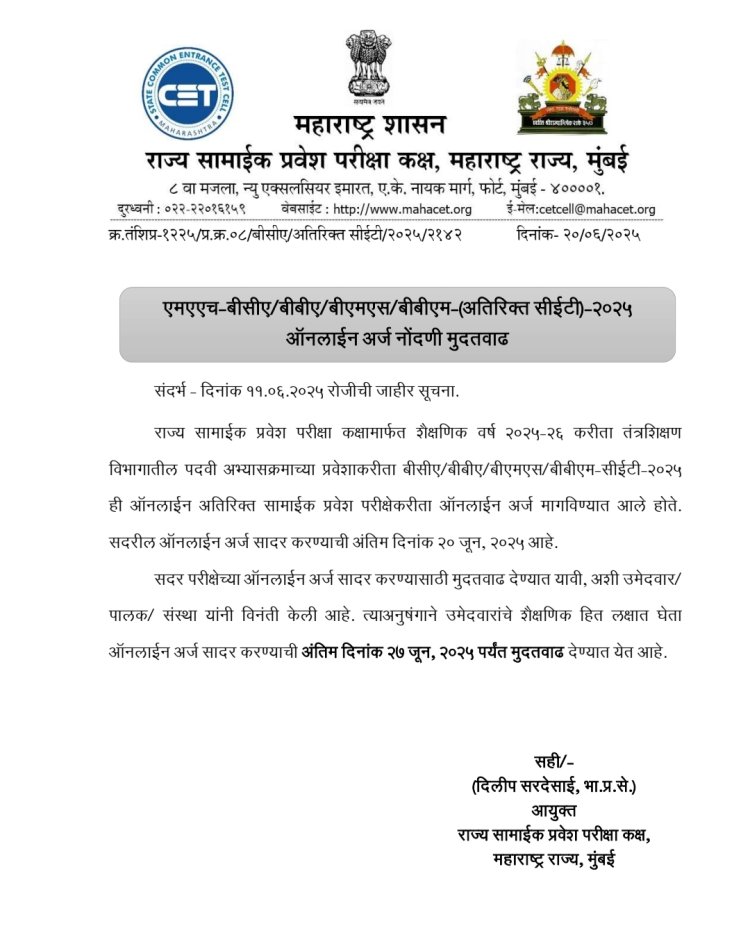 सीईटी सेलमार्फत शैक्षणिक वर्ष २०२५-२६ करीता तंत्रशिक्षण विभागातील पदवी अभ्यासक्रमाच्या प्रवेशासाठी बीसीए/बीबीए/बीएमएस/बीबीएम-सीईटी-२०२५ ही ऑनलाईन अतिरिक्त सामाईक प्रवेश परीक्षेकरीता ऑनलाईन अर्ज मागविण्यात आले होते. ही ऑनलाईन अर्ज सादर करण्याची अंतिम दिनांक २० जून २०२५ पर्यंत देण्यात आली होती. मात्र, आता नोंदणीसाठी मुदतवाढ देण्यात आली आहे.