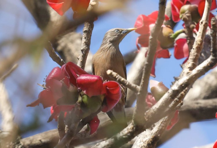 - लाल फुलांच्या काटेसावर झाडावर करड्या डोक्याची मैना आढळली