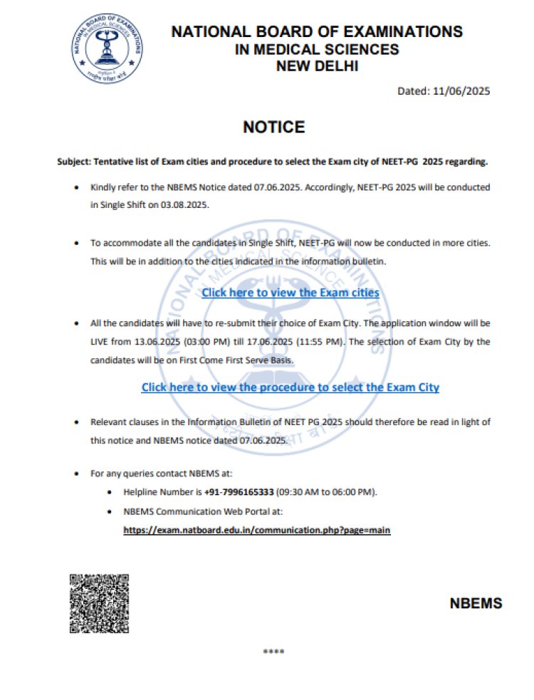 उमेदवारांना आता 13 जून 2025 (दुपारी 3 वाजता) ते 17 जून 2025 (रात्री 11:55 वाजता) पर्यंत अधिकृत पोर्टलद्वारे त्यांच्या पसंतीच्या परीक्षा शहरांची यादी पुन्हा सादर करावी लागणार आहे. NBEMS ने स्पष्ट केले आहे की, शहर वाटप प्रक्रिया उमेदवारांच्या प्राधान्य आणि उपलब्धतेनुसार प्रथम येणाऱ्यास प्राधान्य या तत्त्वावर चालेल.