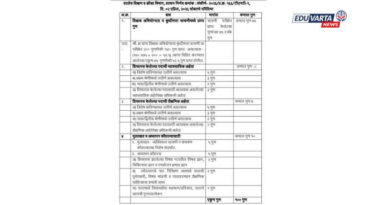 सुधारित गुणांकन प्रक्रियेनुसार एकूण १०० गुणांपैकी सर्वाधिक गुण प्राप्त करणाऱ्या उमेदवाराची निवड करुन त्यास नियुक्ती देणे क्रमप्राप्त राहील. उमेदवारांना समसमान गुण प्राप्त झाले असतील, अशा परिस्थितीत ज्या उमेदवाराचे वय अधिक आहे, अशा उमेदवाराची निवड करुन त्यास नियुक्ती देणे क्रमप्राप्त राहील. उमेदवारांचे वय देखील सारखे असल्यास इयत्ता १२ वी चे गुण विचारात घेण्यात यावेत. संबंधित शिक्षणाधिकारी/शिक्षण उपसंचालक यांनी संबंधित संस्थेस उपलब्ध करुन देण्यात आलेल्या सर्व उमेदवारांचे विहित प्रकारे गुणांकन झाले आहे किंवा कसे, याची खातरजमा करुनच उमेदवाराच्या निवडीस व नियुक्तीस मान्यता द्यावी.शिक्षक अभियोग्यता व बुध्दीमत्ता चाचणी-सन २०२५ या परीक्षेतील व यापुढे होणाऱ्या अशा परीक्षेतील गुणांच्या आधारे शिक्षक पदभरतीसाठी प्रस्तावांतर्गत गुणांकन प्रक्रिया लागू राहील,असे 2 एप्रिल 2026 रोजी प्रसिद्ध केलेल्या अध्यादेशानुसार प्रसिद्ध करण्यात आले आहे.