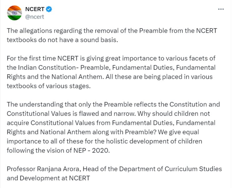 अलीकडेच अनेक मीडिया रिपोर्ट्समध्ये दावा करण्यात आला होता की, एनसीईआरटीने यावर्षी प्रसिद्ध केलेल्या इयत्ता 3 आणि इयत्ता 6 च्या पाठ्यपुस्तकांमधून संविधानाची प्रस्तावना काढून टाकण्यात आली आहे. NCERT ने ट्विट करून हा आरोप खोटा ठरवला आहे.