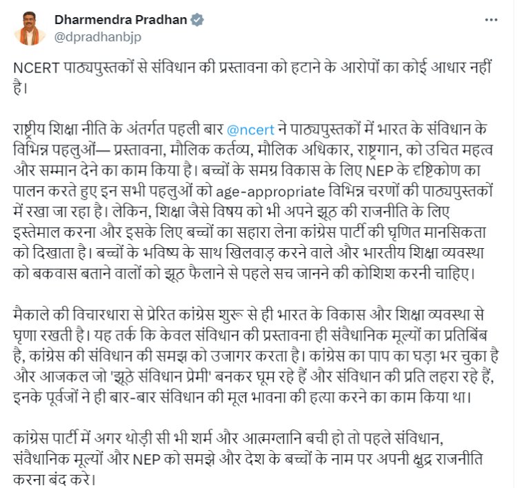 एनसीईआरटीच्या पुस्तकांमधून राज्यघटनेची प्रस्तावना काढून टाकल्याचा आरोप निराधार असल्याचे सांगत एनसीईआरटी आणि शिक्षण मंत्री धर्मेंद्र प्रधान 'एक्स' या सोशल मीडियाद्वारे सर्व आरोप फेटाळत स्पष्टीकरण दिले आहे.
