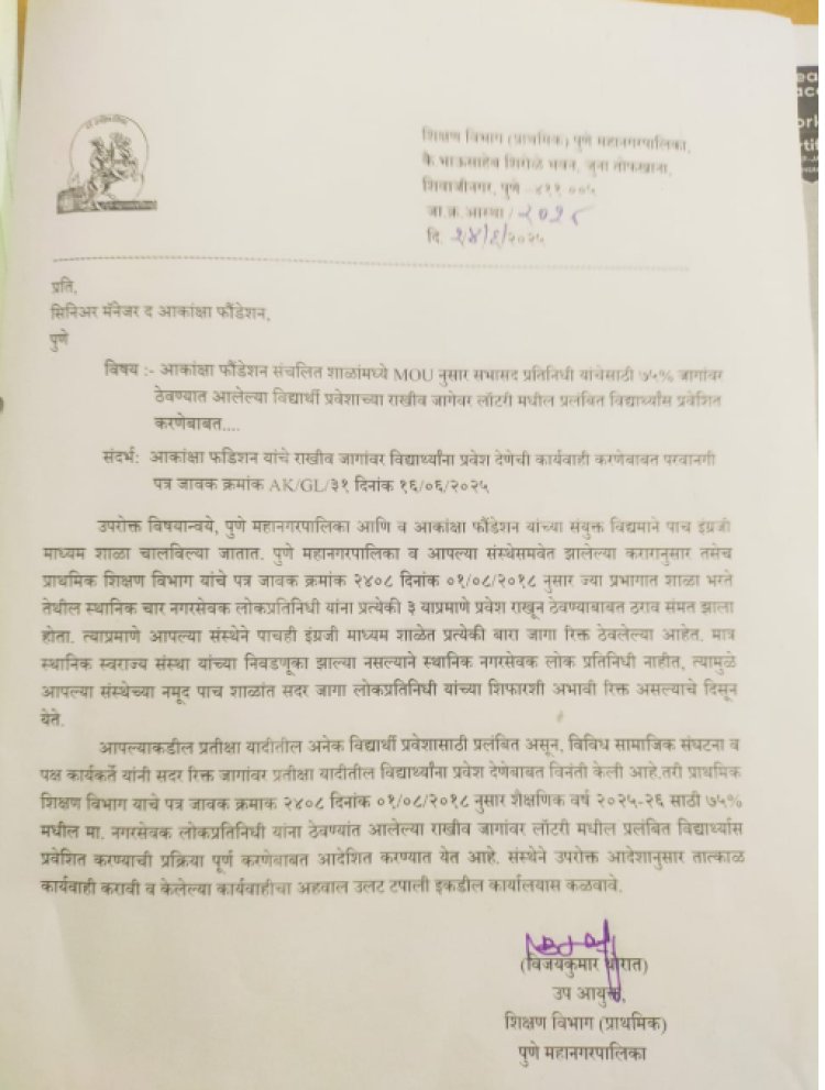 पुणे शहरात महानगरपालिका आणि आकांक्षा फाउंडेशन संयुक्त विद्यमाने पाच शाळा चालवितात. यामध्ये काही जागा नगरसेवकांच्या शिफारसीनुसार भरल्या जातात. परंतु गेल्या तीन वर्षात निवडणुका न झाल्यामुळे नगरसेवक पद रिक्त आहेत आणि त्यामुळे काही मुलांचे प्रवेश रखडले होते. यासंदर्भात आता आम आदमी पार्टीच्या मागणीनुसार या जागी तातडीने लॉटरी मधील प्रतीक्षा यादीतील मुलांना प्रवेश देण्यात यावेत, असा आदेश मनपा उपायुक्त विजयकुमार थोरात यांनी काढला आहे.