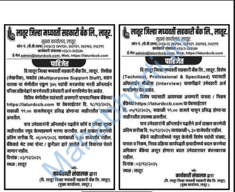 लातूर जिल्हा बँकेत ३७५ पदांसाठी भरती सुरू, 'या' तारखेपर्यंत करा अर्ज