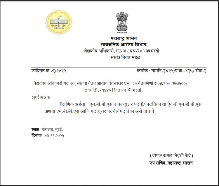 सरकारी नोकरीच्या शोधात असलेल्या उमेदवारांसाठी मोठी आणि महत्त्वाची अपडेट समोर आली आहे. बारावी ते पदवीधर उत्तीर्ण असलेल्या उमेदवारांसाठी आरोग्य विभागात (Health Department) भरती प्रक्रिया जाहीर (Recruitment process announced) करण्यात आली आहे. या भरती अंतर्गत आरोग्य अधिकारी (गट-अ) या पदांच्या १ हजार ४४० जागा (1,440 vacancies for Health Officer posts) भरण्यात येणार आहेत. इच्छुक आणि पात्र उमेदवारांना वेळेत अर्ज करण्याचे आवाहन करण्यात आले आहे. या पदासाठी आवश्यक असलेली सविस्तर माहिती खाली देण्यात आलेली आहे.