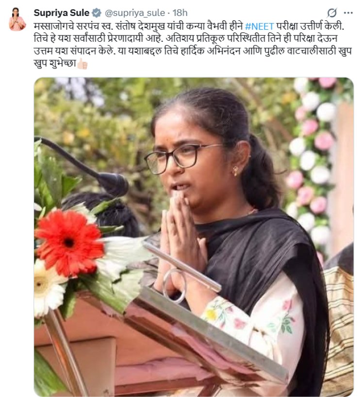 मस्साजोगचे सरपंच स्व. संतोष देशमुख यांची कन्या वैभवी हीने NEET परीक्षा उत्तीर्ण केली, तिचे हे यश सर्वांसाठी प्रेरणादायी आहे. अतिशय प्रतिकूल परिस्थितीत तिने ही परीक्षा देऊन उत्तम यश संपादन केले. या यशाबद्दल तिचे हार्दिक अभिनंदन आणि पुढील वाटचालीसाठी खूप खूप शुभेच्छा!, अशी भावना सुप्रिया सुळे यांनी व्यक्त केली आहे.