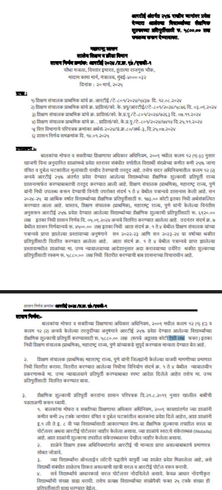 राज्यातील अनेक शाळांनी आरटीईअंतर्गत प्रवेश दिले होते परंतु, प्रतिपूर्तीची रक्कम वेळेवर मिळाली नाही त्यामुळे शाळा व्यवस्थापन अडचणीत आले होते. अनेक शाळांनी वारंवार शासनाकडे पाठपुरावा करूनही रक्कम मिळण्यात विलंब होत होता. एवढचं नाही तर काही संस्थाचालकांनी विद्यार्थ्यांकडून १०० टक्के रक्कम घेण्याचा पवित्रा हाती घेतला होता. मात्र, शासनाने हा निधी मंजूर करून शाळा व संस्थाचालकांना दिलासा दिला आहे.