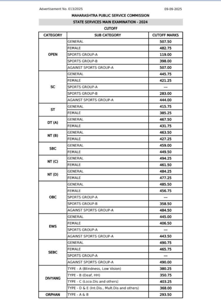 या परीक्षेचा कट ऑफ काही प्रमाणात वाढला असल्याचे दिसून येत आहे. खुल्या गटाचा कट ऑफ ५०७ असून, एसईबीसी ४९०, ओबीसी ४८५, एनटी ४६३, ईडब्ल्यूएस आणि एससी ४४५, तर एसटीचा कट ऑफ ४१५ आहे. ही परीक्षा २७, २८ आणि २९ मे २०२५ रोजी घेण्यात आली होती. MPSC राज्यसेवा २०२४ परीक्षेचे उद्दिष्ट ५२४ पदे भरण्याचे आहे. मुख्य परीक्षा उत्तीर्ण झाल्यानंतर उमेदवारांना कागदपत्रांची पडताळणी आणि वैद्यकीय तपासणी करावी लागेल. त्यानंतर त्यांची मुलाखतीसाठी निवड केली जाईल.