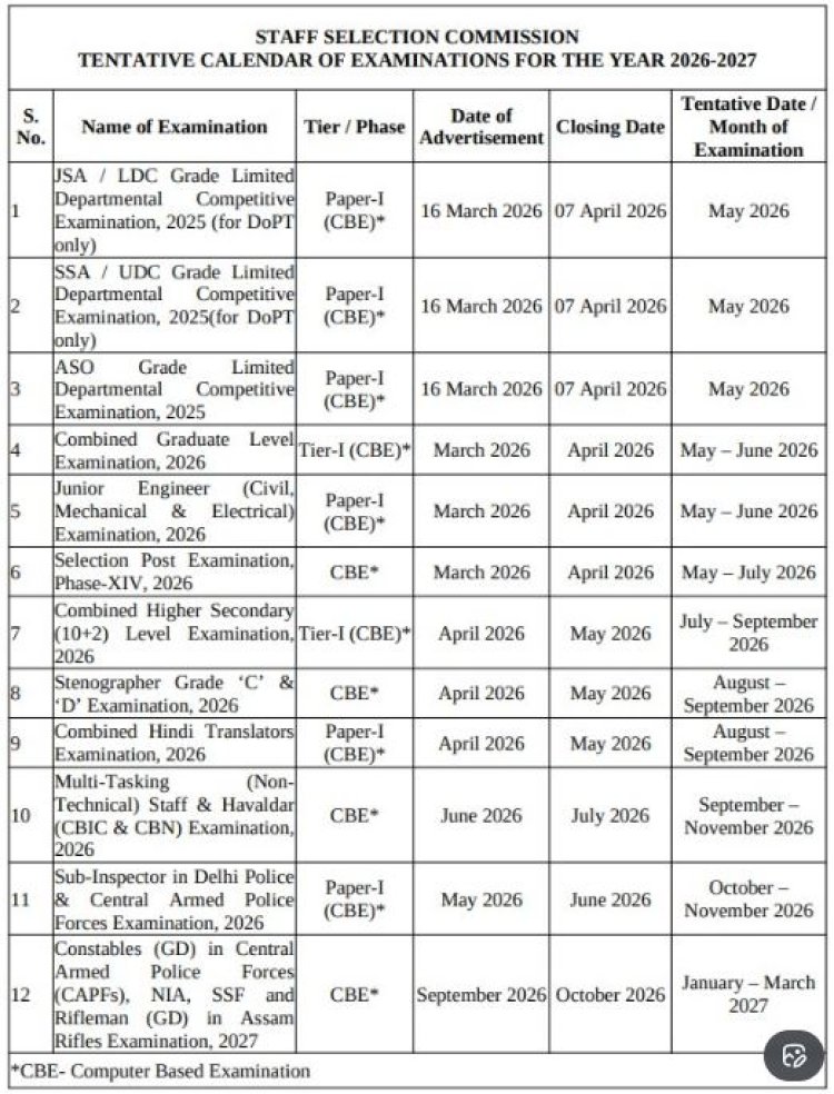 कर्मचारी निवड आयोगाने (SSC) CGL, CHSL, MTS, JE, सिलेक्शन पोस्ट, दिल्ली पोलीस आणि CAPF मधील उपनिरीक्षक, स्टेनोग्राफर, GD कॉन्स्टेबल आणि इतर अनेक परीक्षांसह विविध राष्ट्रीय-स्तरीय परीक्षांचे वेळापत्रक दर्शवणारे अपलोड केली आहे. जे उमेदवार आगामी एसएससी परीक्षांची तयारी करत आहेत किंवा पुढील वर्ष २०२६-२७ मध्ये होणाऱ्या परीक्षांची तयारी करण्याची योजना आखत आहेत, त्यांना आपली तयारी सुरळीत करण्यासाठी या परीक्षा कॅलेंडरचा उपयोग होणार आहे.